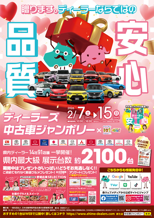 2026年2月7日(土)~15日(日)の期間、毎年恒例の愛媛県下ディーラー合同の中古車フェアが開催されます。 ...